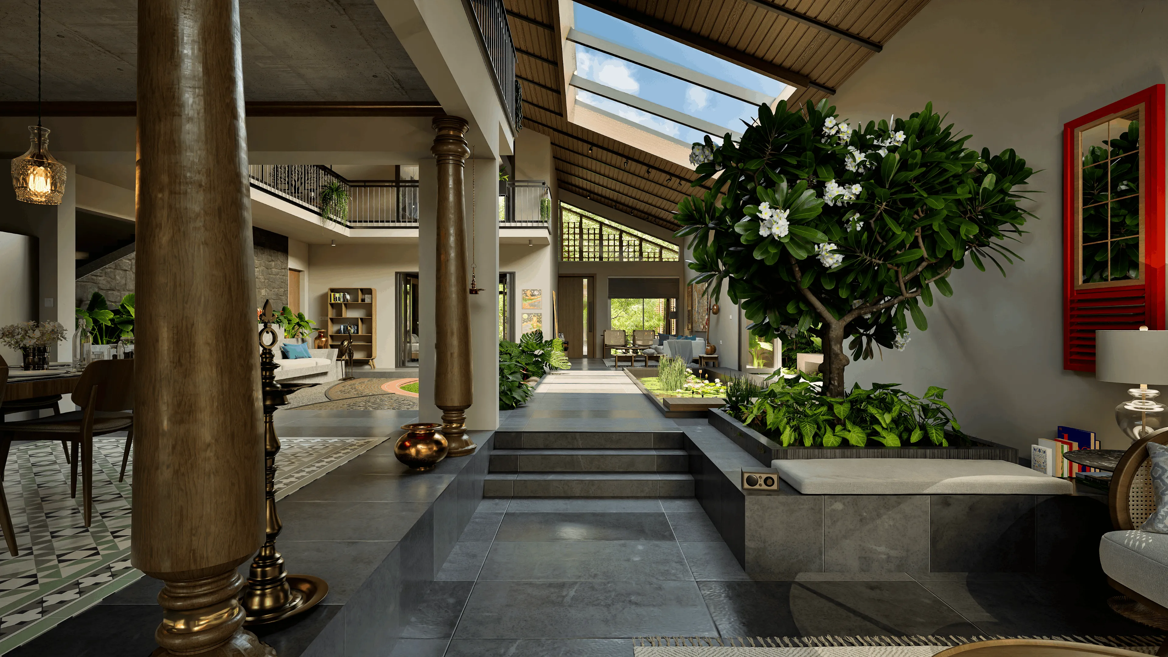 Reclaim the nostalgia of your visits ‘home’ where your home was the space you needed it to be in that moment. An airy fluid space at the center of the home that is flexible to your family’s rhythms. A space that unfurls from its double height courtyard from kitchen to living so that big and small celebrations, quiet contemplation, joint hobbies, big food prep, work or play all are possible with light, air and greenery around. A courtyard style living re-imagined for modern life.
