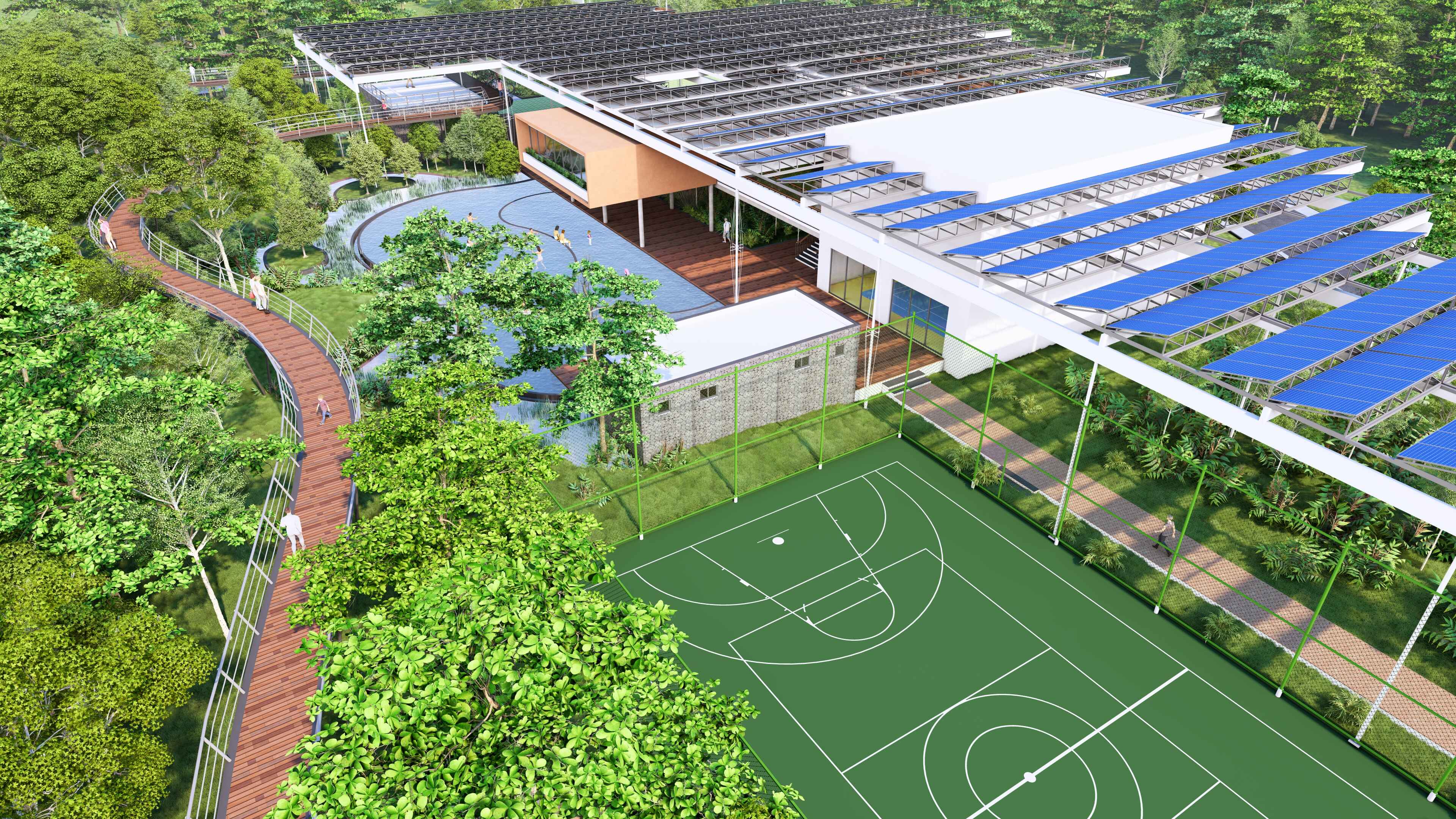 A modern take on a forest community for a deep connection with nature. The outside is inside so you’re part of the ecosystem. Biophilic design ensures every part of the community & home is connected to the outdoors. Set up so that nature is an experience woven across every activity and wellness effortless; Edible gardens in the clubhouse, a forest walkway, unpaved backyard paths that wander through forest guilds that feed people birds, bees and creatures of the earth.